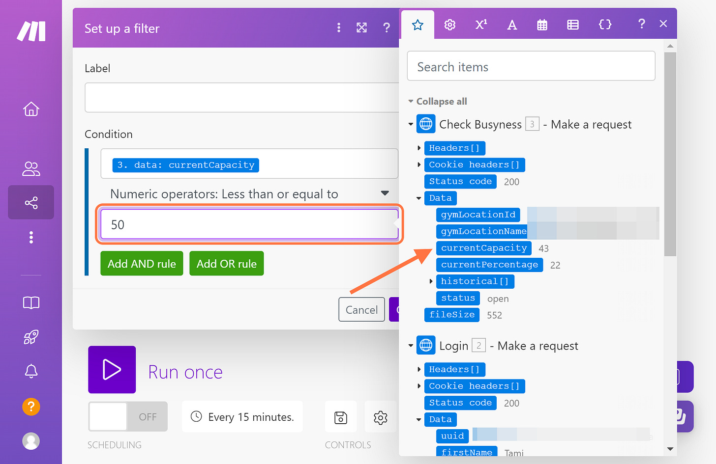 I only want to know when the gym has 50 or fewer people. So, I added a filter that checks the current crowd number, and if itâs less than or equal to 50, it triggers the Logsnag notification.
