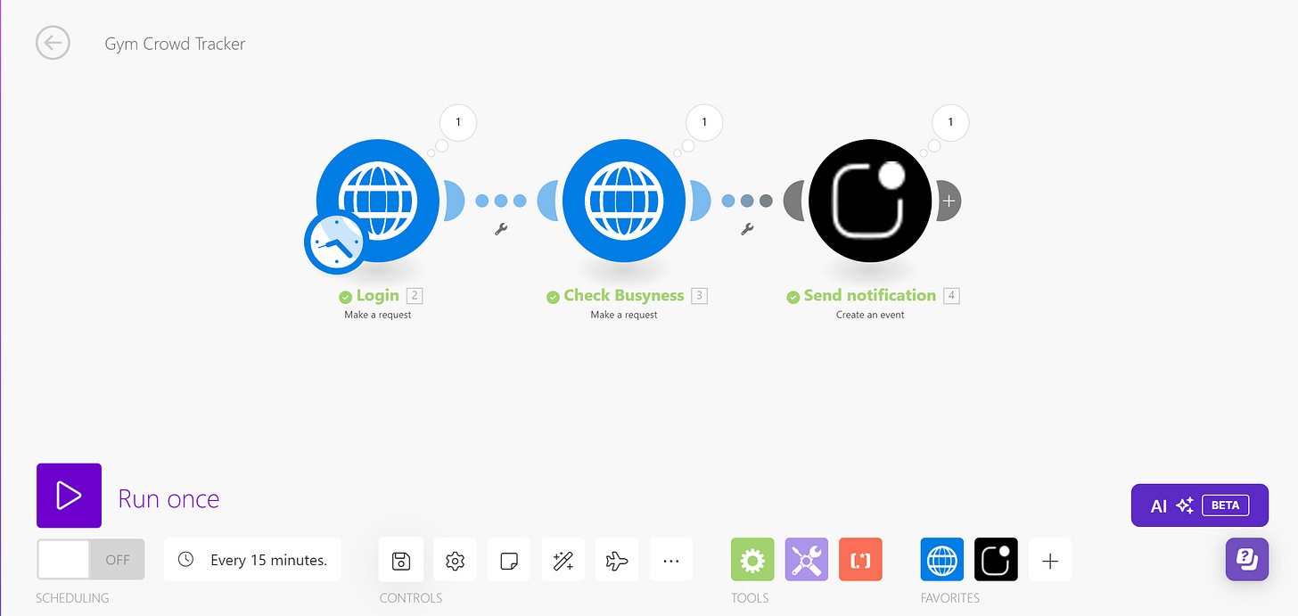 So, Iâve been trying to get into a consistent gym habit. Pick a day and time and go, right? But my gym tends to get super crowded, and for me nothing kills the vibe like a sea of people crammed in and waiting for equipment. My gymâs app shows how many people are there, but the times I picked are always too busy and I have to keep checking every few minutes to see if the capacity has reduced. So, I built a little tool to give me a heads-up when the crowd is manageable.